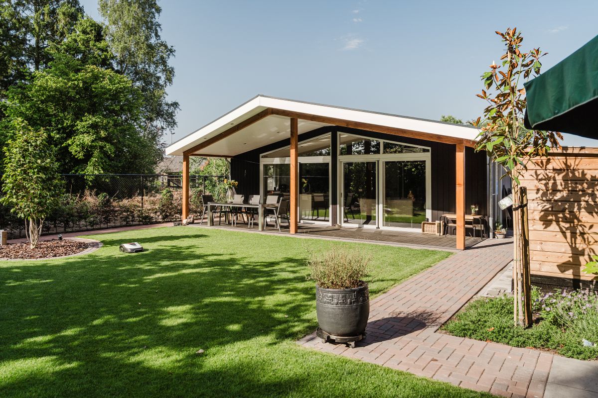 De vierkante woning beschikt over een schitterend overstek, waardoor er in totaal 100 m² overkapte ruimte ontstaat. De composiet vlonderplanken vormen samen met de douglas palen een prachtig geheel. Het plafond binnen is in dezelfde kleur als het plafond buiten, wat zorgt voor een harmonieuze eenheid.